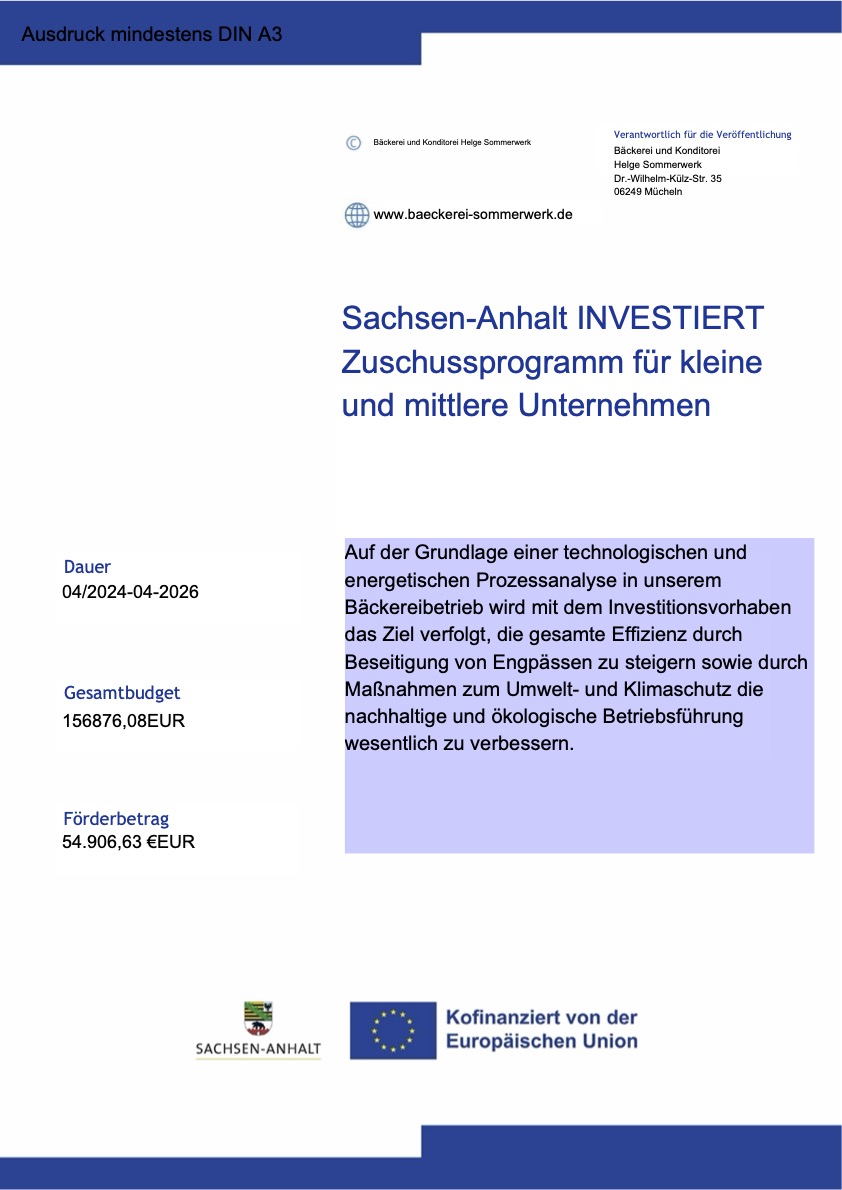 Auf der Grundlage einer technologischen und energetischen Prozessanalyse in unserem Bäckereibetrieb wird mit dem Investitionsvorhaben das Ziel verfolgt, die gesamte Effizienz durch Beseitigung von Engpässen zu steigern sowie durch Maßnahmen zum Umwelt- und Klimaschutz die nachhaltige und ökologische Betriebsführung wesentlich zu verbessern.