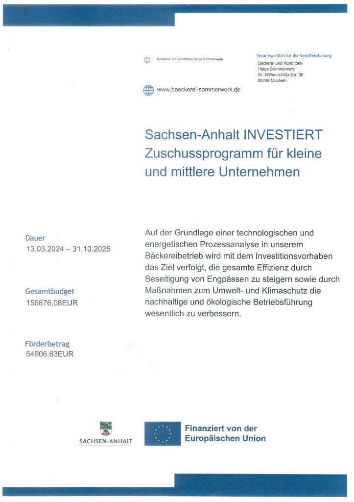 Auf der Grundlage einer technologischen und energetischen Prozessanalyse in unserem Bäckereibetrieb wird mit dem Investitionsvorhaben das Ziel verfolgt, die gesamte Effizienz durch Beseitigung von Engpässen zu steigern sowie durch Maßnahmen zum Umwelt- und Klimaschutz die nachhaltige und ökologische Betriebsführung wesentlich zu verbessern.